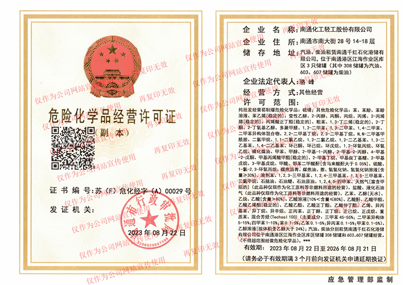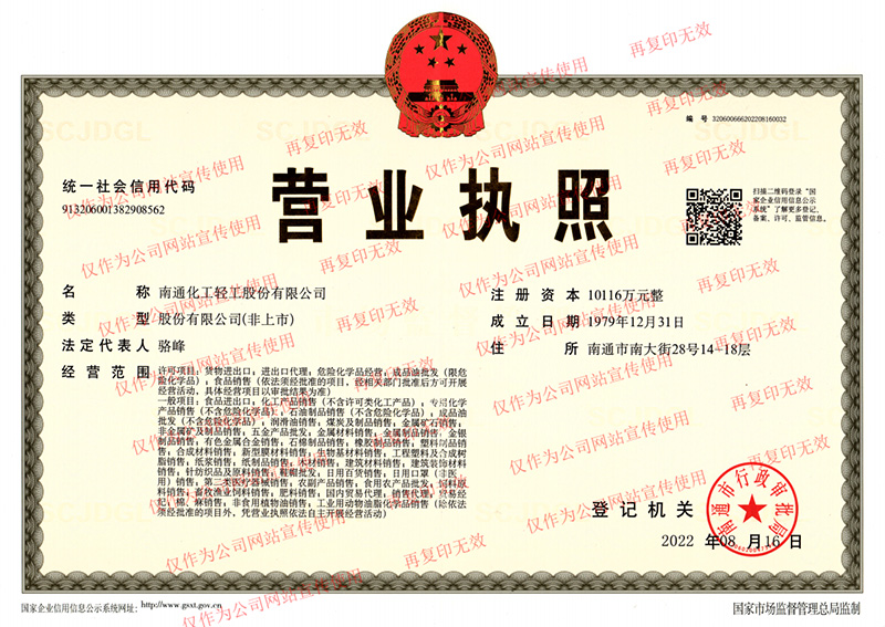 南通化工輕工股份有限公司成立于1963年7月1日, 1997年改制為股份有限公司,注冊資本10116萬元。公司自1963年成立以來,始終堅持“誠信為本”的商信文化,向海內外廣大供應商按時足額履行付款、向廣大客戶按時按質按量按價履行供貨、向金融機構按時足額履行還款等,在商界享有很高聲譽。